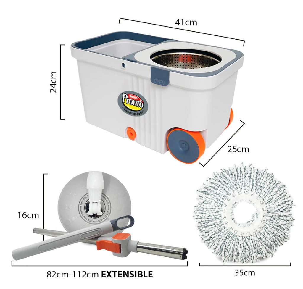 El set está compuesto por una mopa giratoria de 100% microfibra, un cabo extensible y un balde con tambor de acero inoxidable que permite el enjuague y escurrido por centrifugado. Es ideal para cualquier tipo de superficie como cerámicos y porcelanatos, e incluso para suelos delicados como parquet y flotantes.